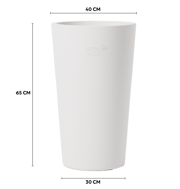 Its clean conical shape, without a collar, plays with light and adapts well to both contemporary gardens and Mediterranean-style terraces.
